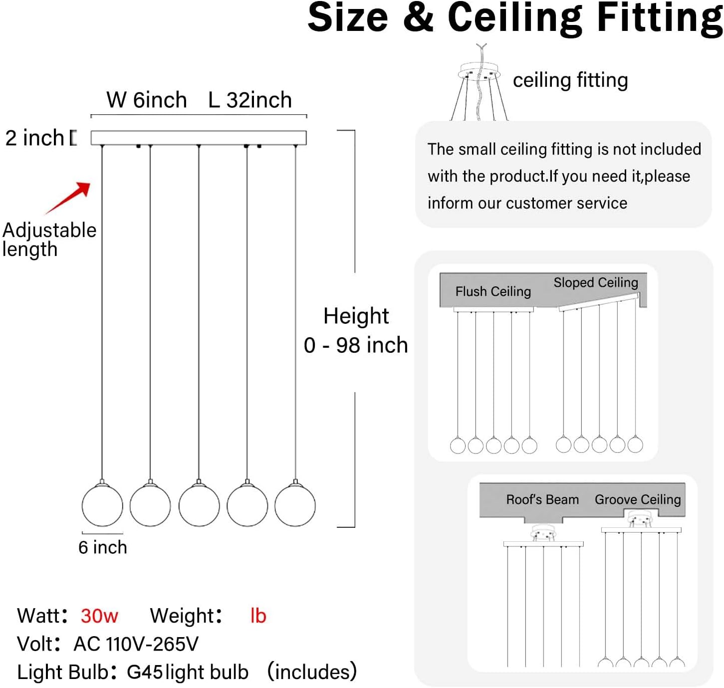 - 【Clear Globe Glass Chandelier Size】Modern Chandelier ceiling plate :L32"x W 6" x H 2", Chandelier max height: 98inch.Glass size:W 6inch * H 6inch,