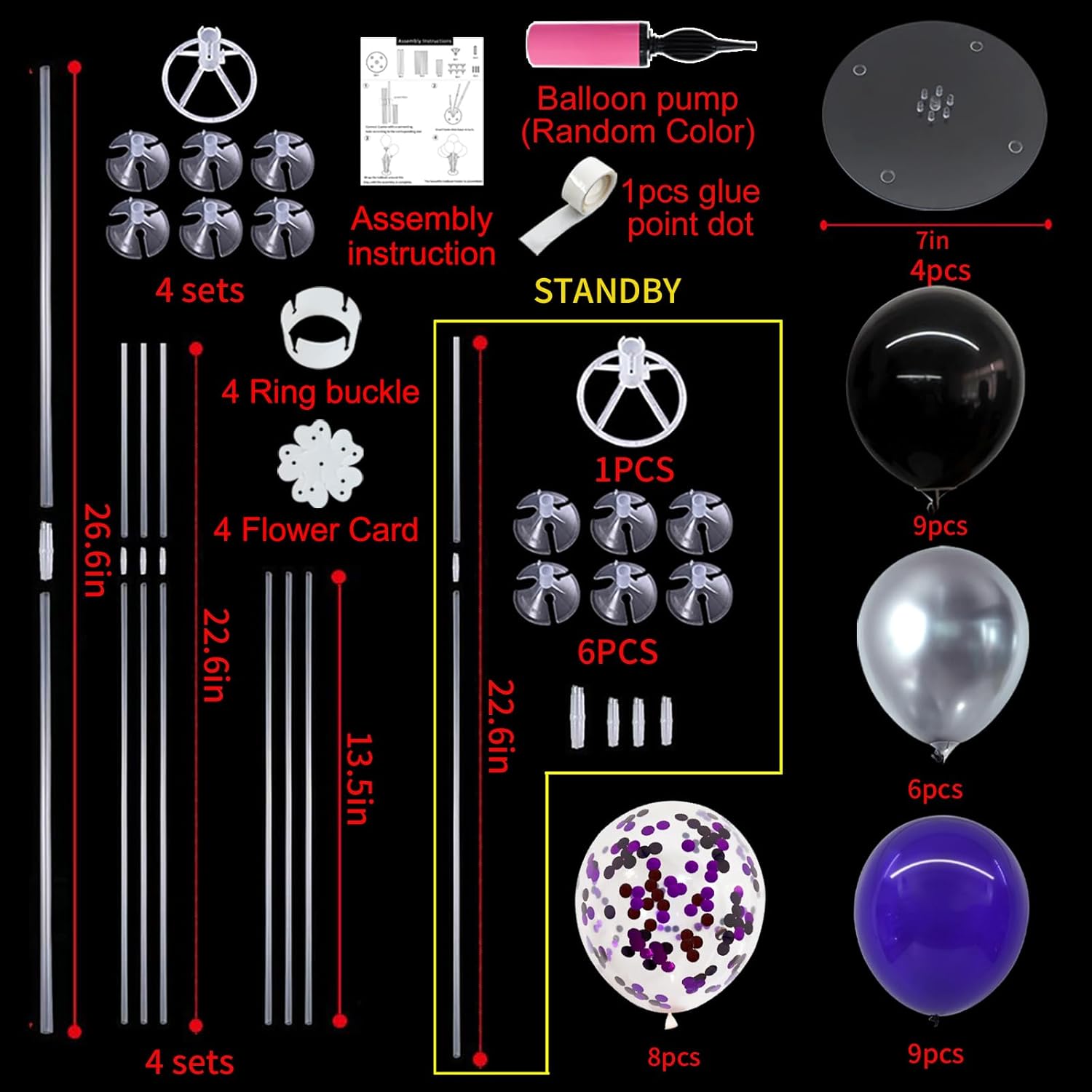 - Stand Holder Size: The balloon stand for table made of reusable plastic.Approximately up to 26.6 inches in height (the height of the balloon stand); Sticks: 1 x approximately 26.6 inches long,3 x approximately 22.6 inches long,3 x approximately 13.5 inches long. Base diameter: approximately 7 inches