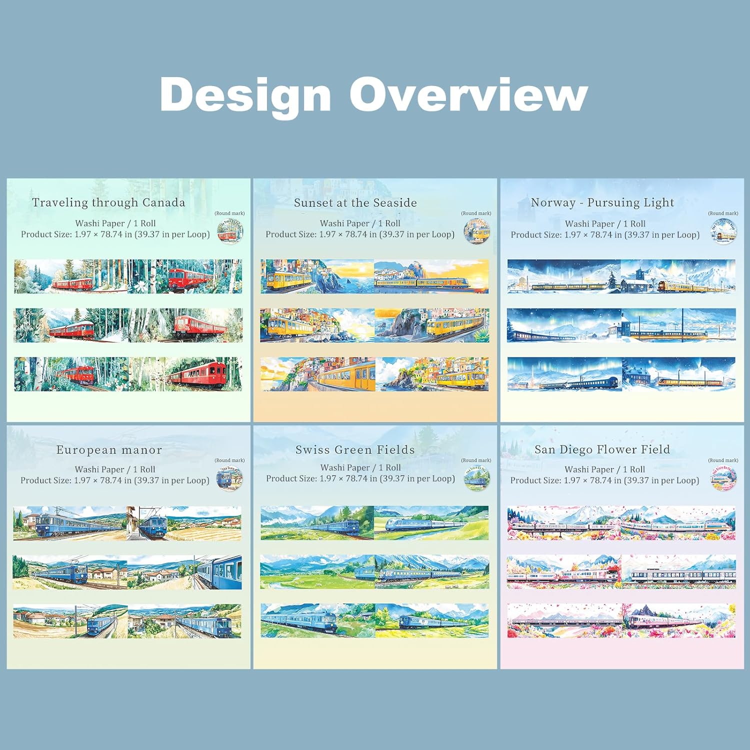 - Train Scenery Designs: 6 unique rolls feature colorful train and landscape illustrations adding a storytelling touch to travel journals scrapbooks and memory albums for creative projects with vivid seasonal charm