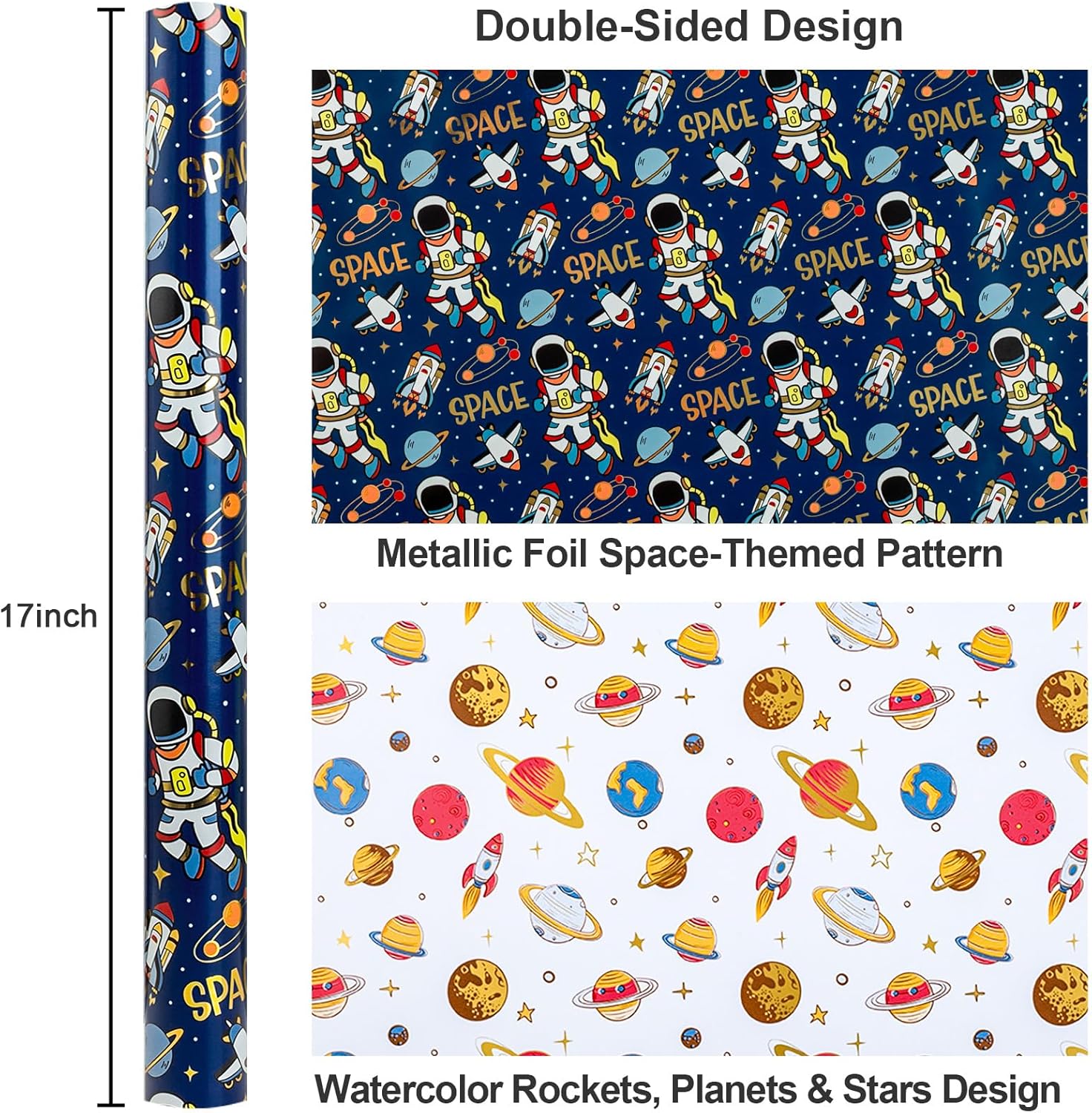 - Double-Sided Galaxy Wonder: Front features metallic foil space scenes; the back displays a starry planet pattern. Whether wrapping or crafting, this Galaxy Birthday Wrapping Paper offers twice the fun with one stylish roll