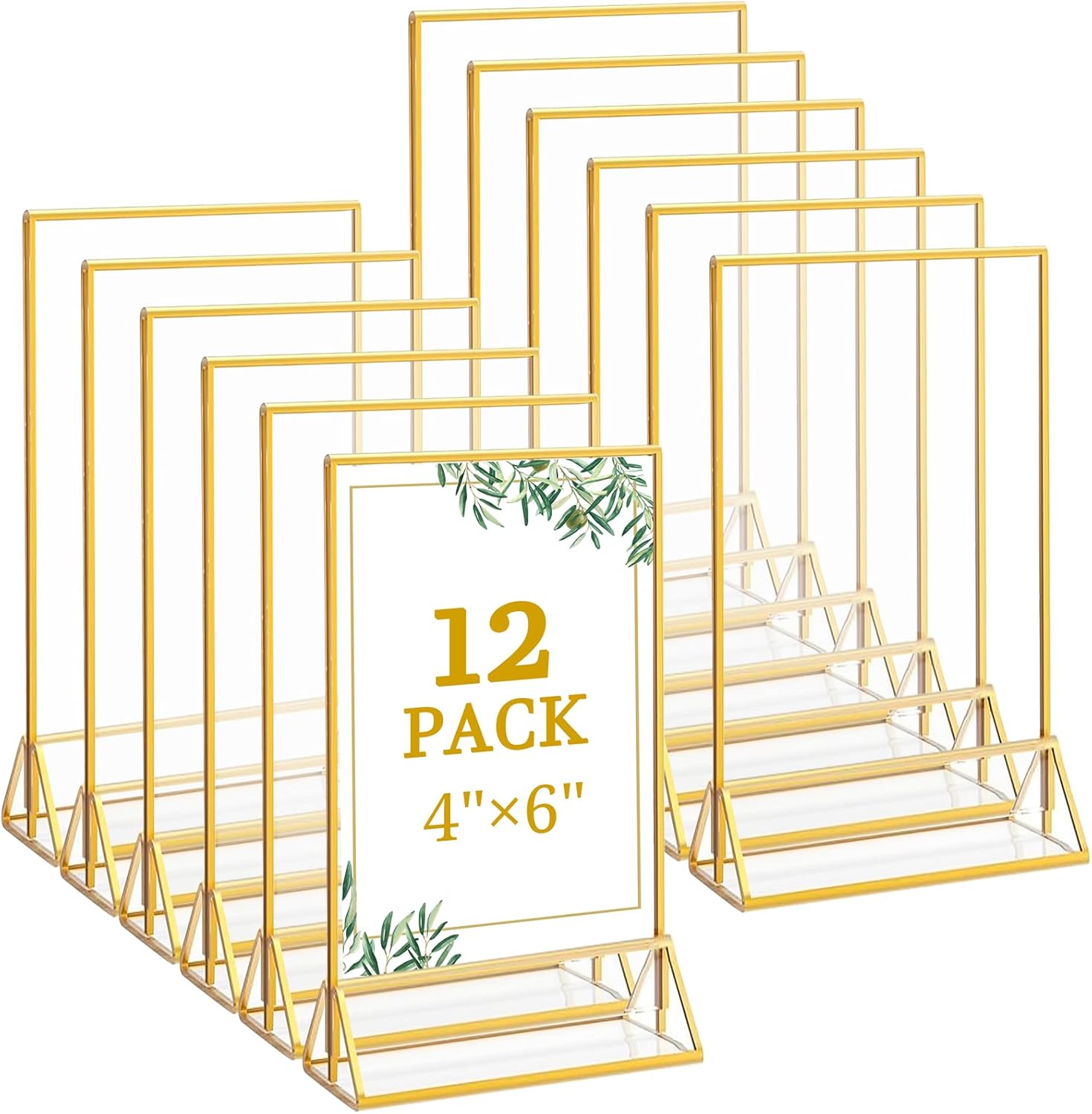 Floroom 12 Pack 4x6 Inch Clear Acrylic Sign Holders, Double-Sided Gold Display Stand Picture Frames for Table Numbers, Menus, Flyers, Weddings, and Offices