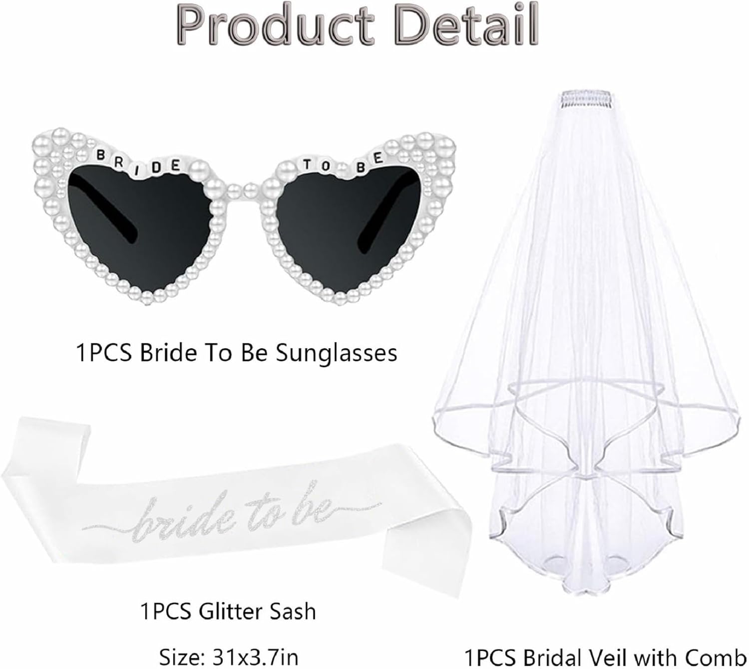 - 【Bachelorette Party Favors】You will receive: 1 x heart pearl "BRIDE TO BE" sunglasses, 1x silver glitter bride to be sash, 1x layer veil. This bridal shower set will be the most beautiful accessory for bride to be and the most thoughtful gift for her