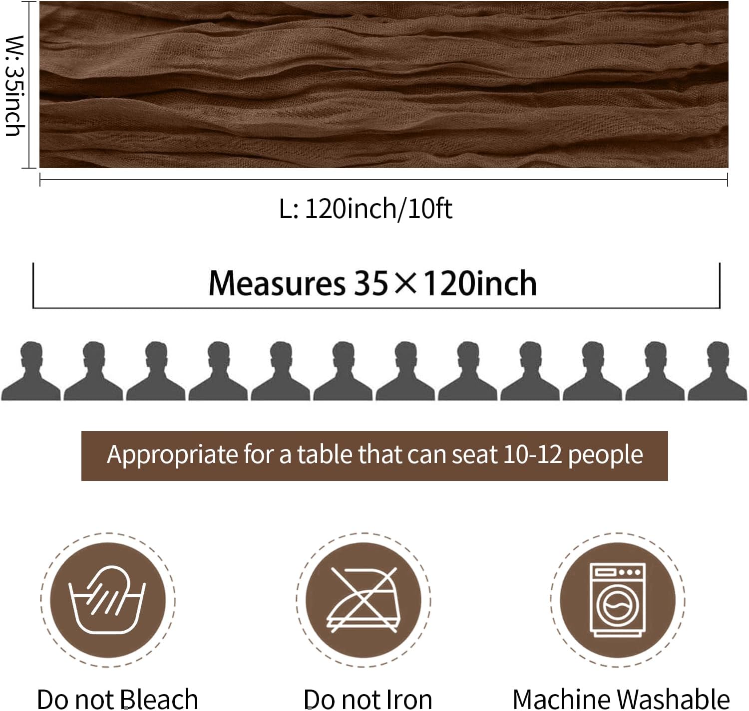 - ☕【Soft & Durable Material】Made of natural cheese gauze fabric, soft to touch, comfortable and long-lasting. Wrinkled design cheese cloth farbic, delicate edges and stitches, adopts seamless technique makes this sheer table runner more graceful than traditional fabrics. A deep brown table cloths spreads the texture of time across the table. It is understated yet exudes an air of sophistication, transforming every gathering into a tasteful ritual.