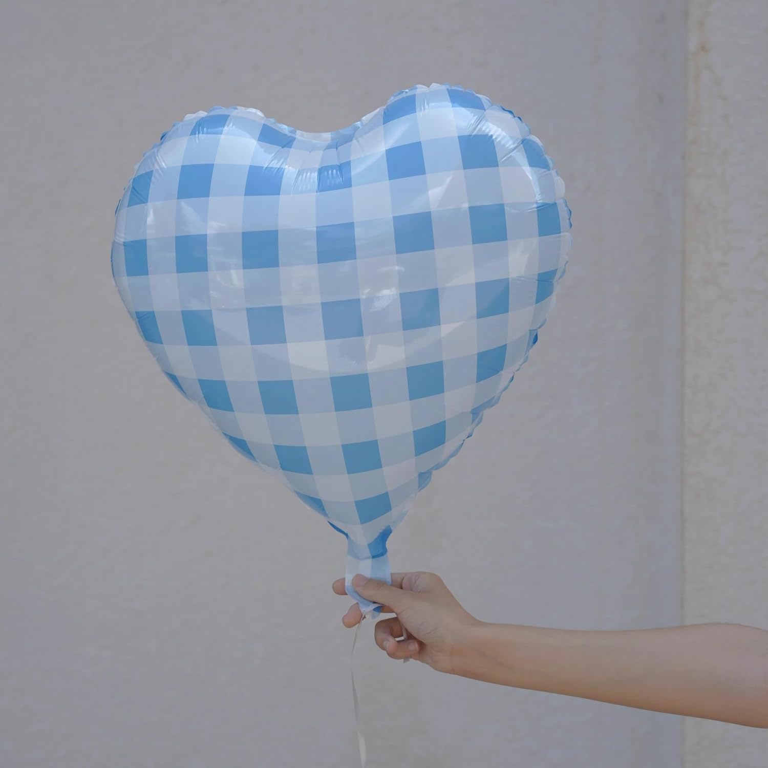 Blue White Checkered Heart Balloons,12Pcs 18Inch Light Blue Grid Heart Shaped Foil Helium Polyester Film Balloons for One Silly Goose Birthday Baby Shower Party Decorations