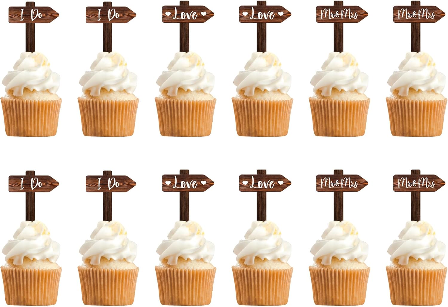12 PCS Rustic Wedding Cupcake Toppers in Wood Wedding Engagement Cake Decorations