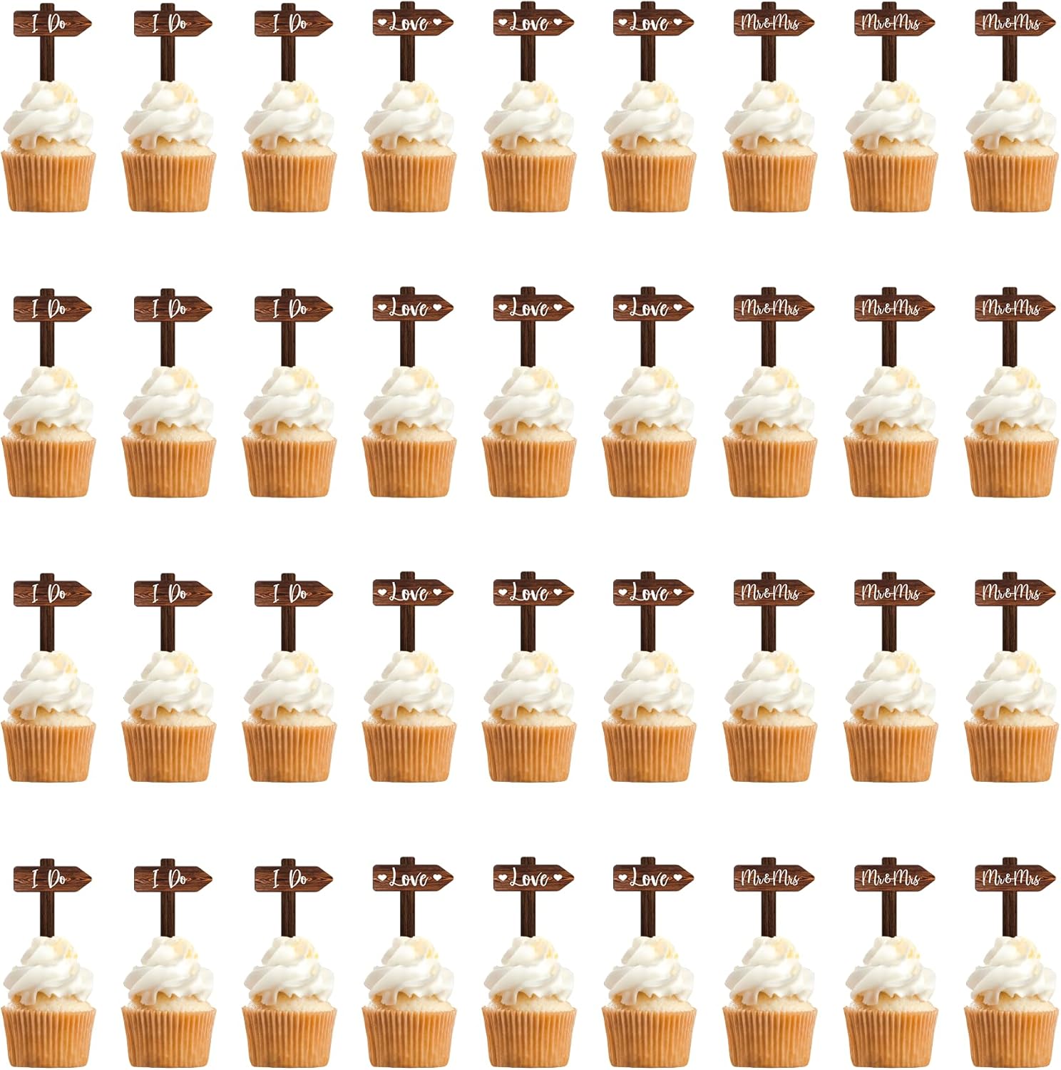 36 PCS Rustic Wedding Cupcake Toppers in Wood Wedding Engagement Cake Decorations