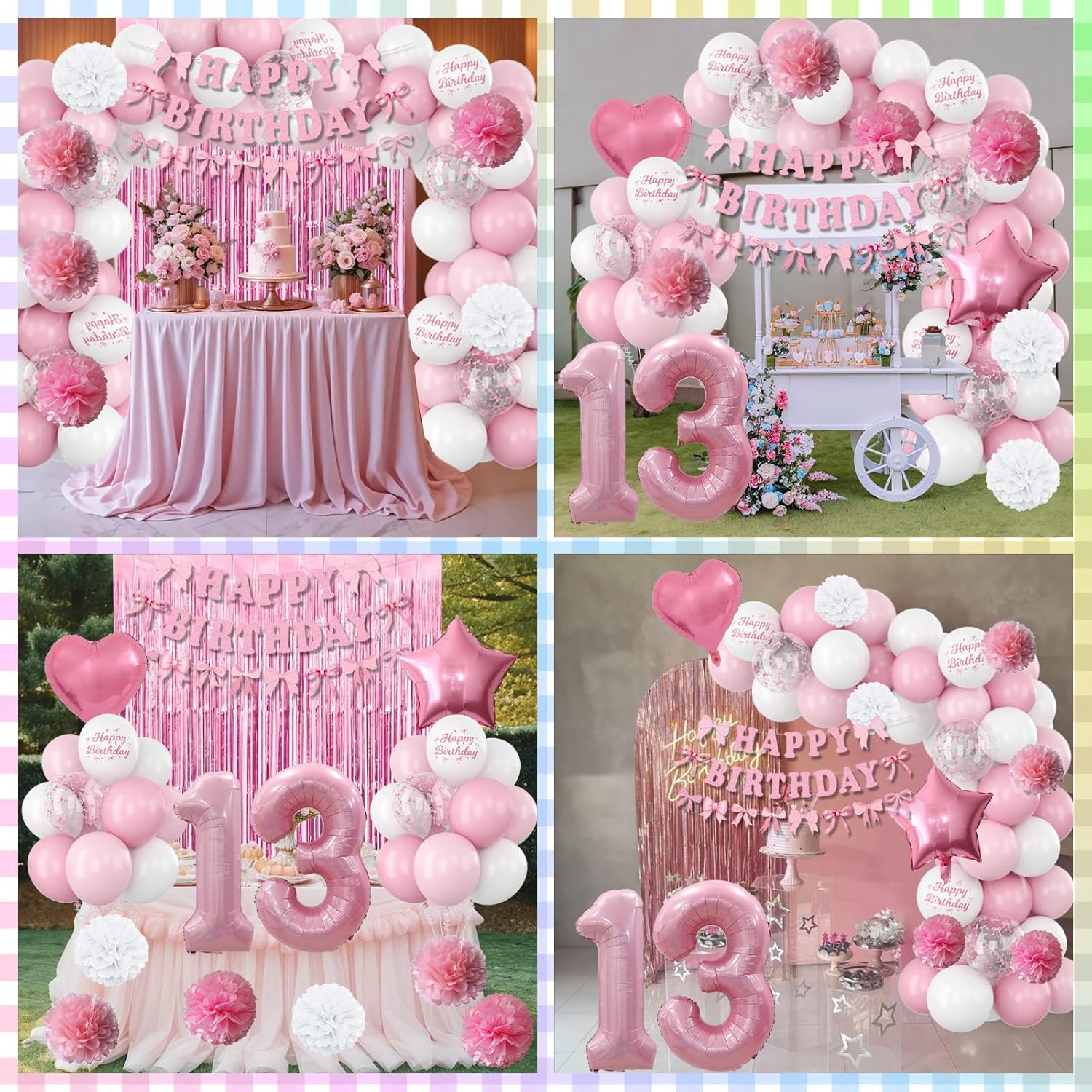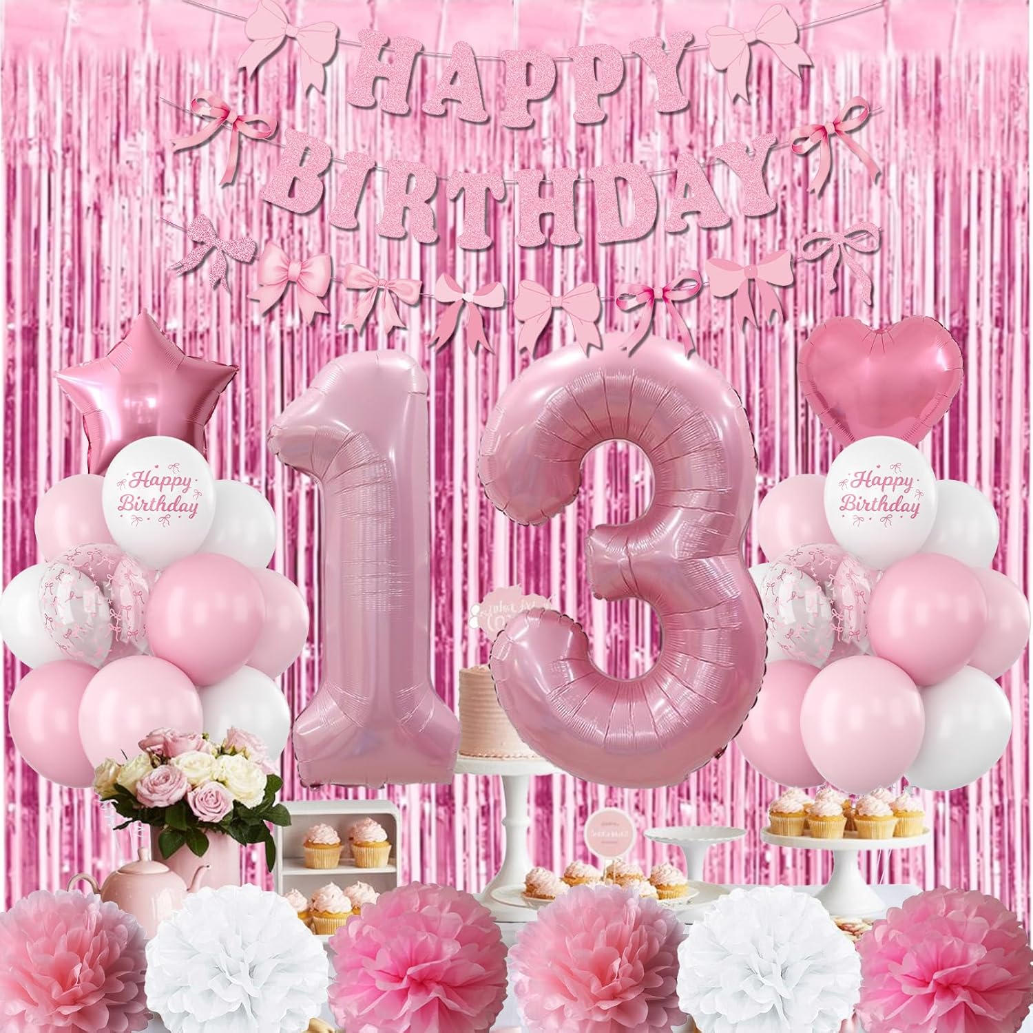 - PACKAGE INCLUDES: 1pc pearl pink number 13 balloon, 1pc bow happy birthday banner, 2pcs pink paper pom poms, 2pcs light pink paper pom poms, 2pcs white paper pom poms, 1pc pink curtain, 1pc light pink star foil balloons, 1pc light pink heart foil balloons,6pcs light pink balloons, 6pcs pastel pink balloons, 4pcs white balloons, 2pcs birthday printed balloons, 2pcs bow clear balloons, 1pc ribbon