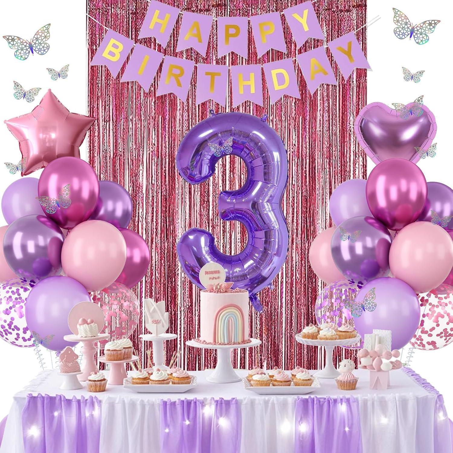 - PACKAGE INCLUDES: 1pc purple number 3 balloon, 1pc happy birthday banner, 2pcs light pink paper pom poms, 2pcs light purple paper pom poms, 2pcs hot pink paper pom poms, 1pc light pink fringe curtain, 1pc light pink star foil balloons, 1pc light purple heart foil balloons, 6pcs pastel purple balloons, 6pcs pastel pink balloons, 4pcs metallic purple balloons, 4pcs metallic magenta balloons, 3pcs purple confetti ballons, 3pcs pink confetti ballons, 1pc butterfly stickers set, 1pc ribbon