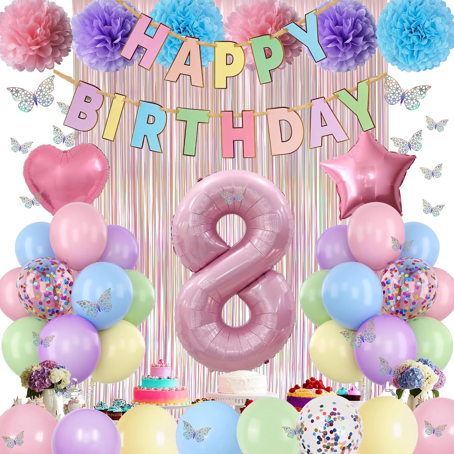 - PACKAGE INCLUDES: 1pc pearl pink number 8 balloon, 1pc happy birthday banner, 2pcs light pink paper pom poms, 2pcs light purple paper pom poms, 2pcs light blue paper pom poms, 1pc colorful white curtain, 1pc light pink star foil balloons, 1pc light pink heart foil balloons, 4pcs pastel purple balloons, 4pcs pastel pink balloons, 4pcs pastel blue balloons, 4pcs pastel green balloons, 4pcs pastel yellow balloons, 4pcs colorful confetti balloons, 1pc butterfly stickers set, 1pc ribbon