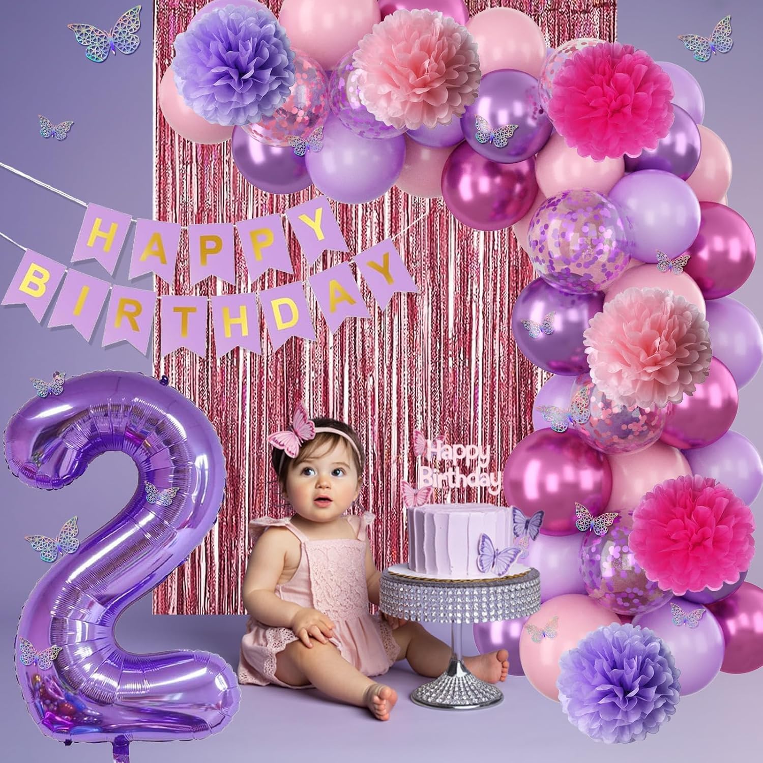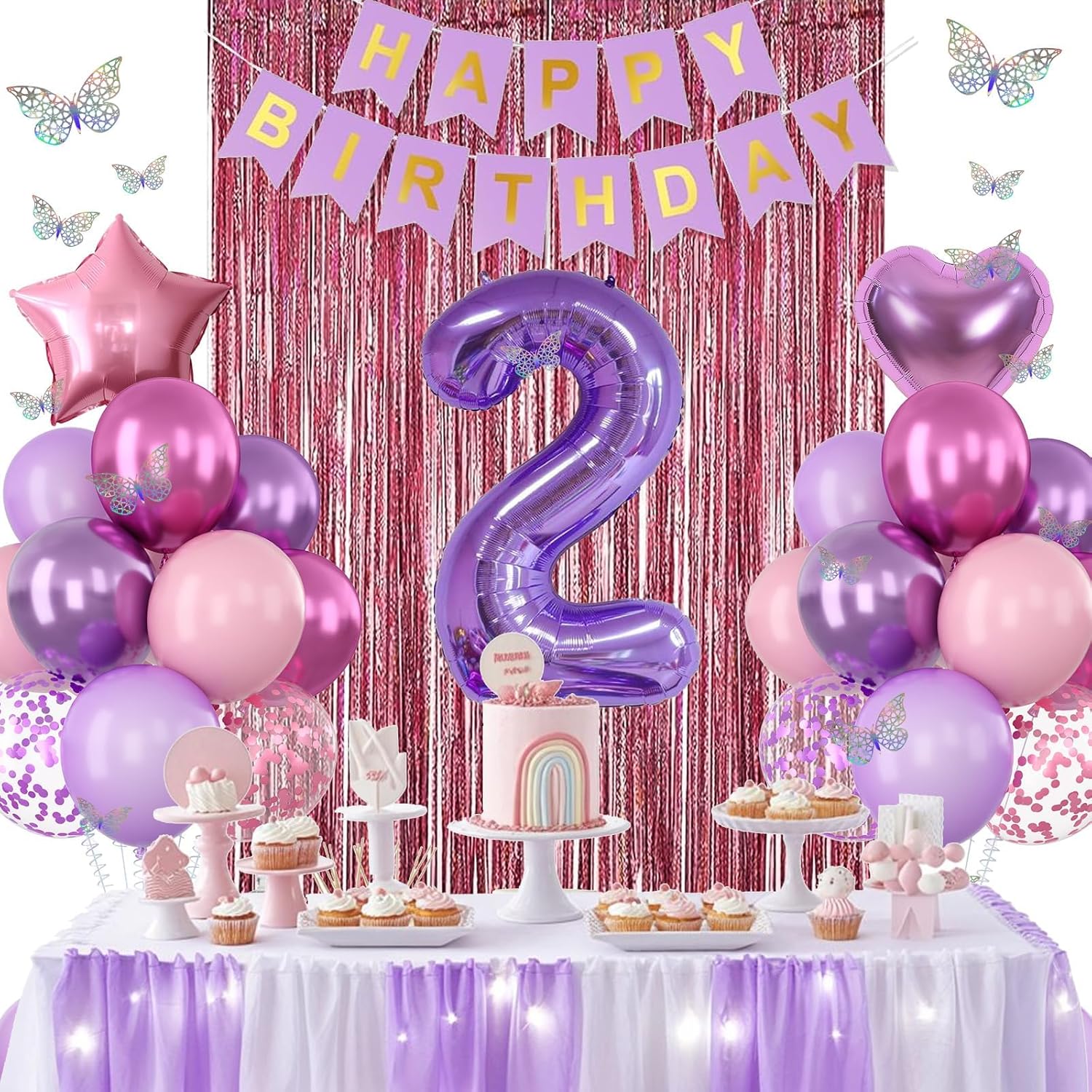 - PACKAGE INCLUDES: 1pc purple number 2 balloon, 1pc happy birthday banner, 2pcs light pink paper pom poms, 2pcs light purple paper pom poms, 2pcs hot pink paper pom poms, 1pc light pink fringe curtain, 1pc light pink star foil balloons, 1pc light purple heart foil balloons, 6pcs pastel purple balloons, 6pcs pastel pink balloons, 4pcs metallic purple balloons, 4pcs metallic magenta balloons, 3pcs purple confetti ballons, 3pcs pink confetti ballons, 1pc butterfly stickers set, 1pc ribbon