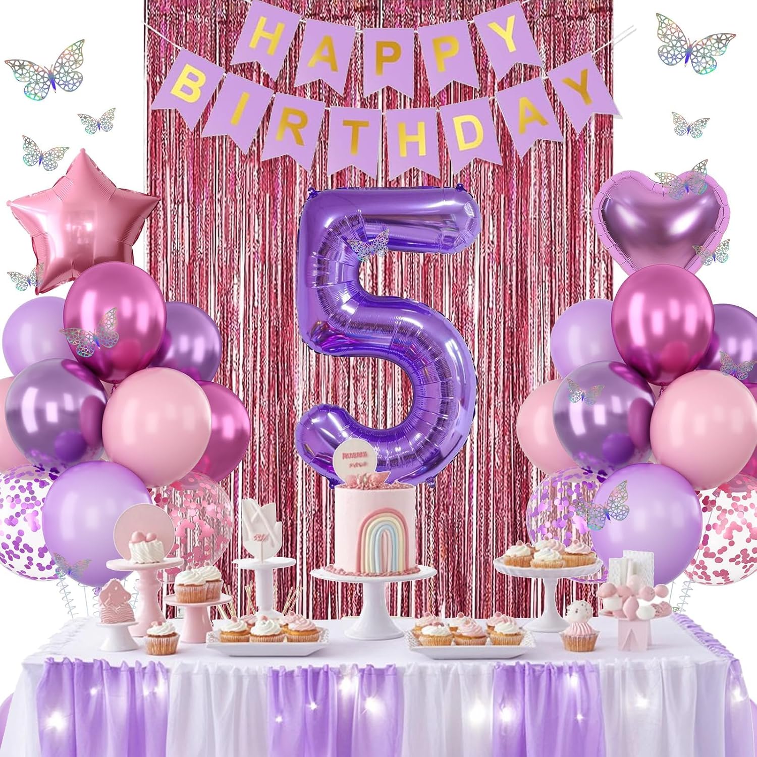 - PACKAGE INCLUDES: 1pc purple number 5 balloon, 1pc happy birthday banner, 2pcs light pink paper pom poms, 2pcs light purple paper pom poms, 2pcs hot pink paper pom poms, 1pc light pink fringe curtain, 1pc light pink star foil balloons, 1pc light purple heart foil balloons, 6pcs pastel purple balloons, 6pcs pastel pink balloons, 4pcs metallic purple balloons, 4pcs metallic magenta balloons, 3pcs purple confetti ballons, 3pcs pink confetti ballons, 1pc butterfly stickers set, 1pc ribbon
