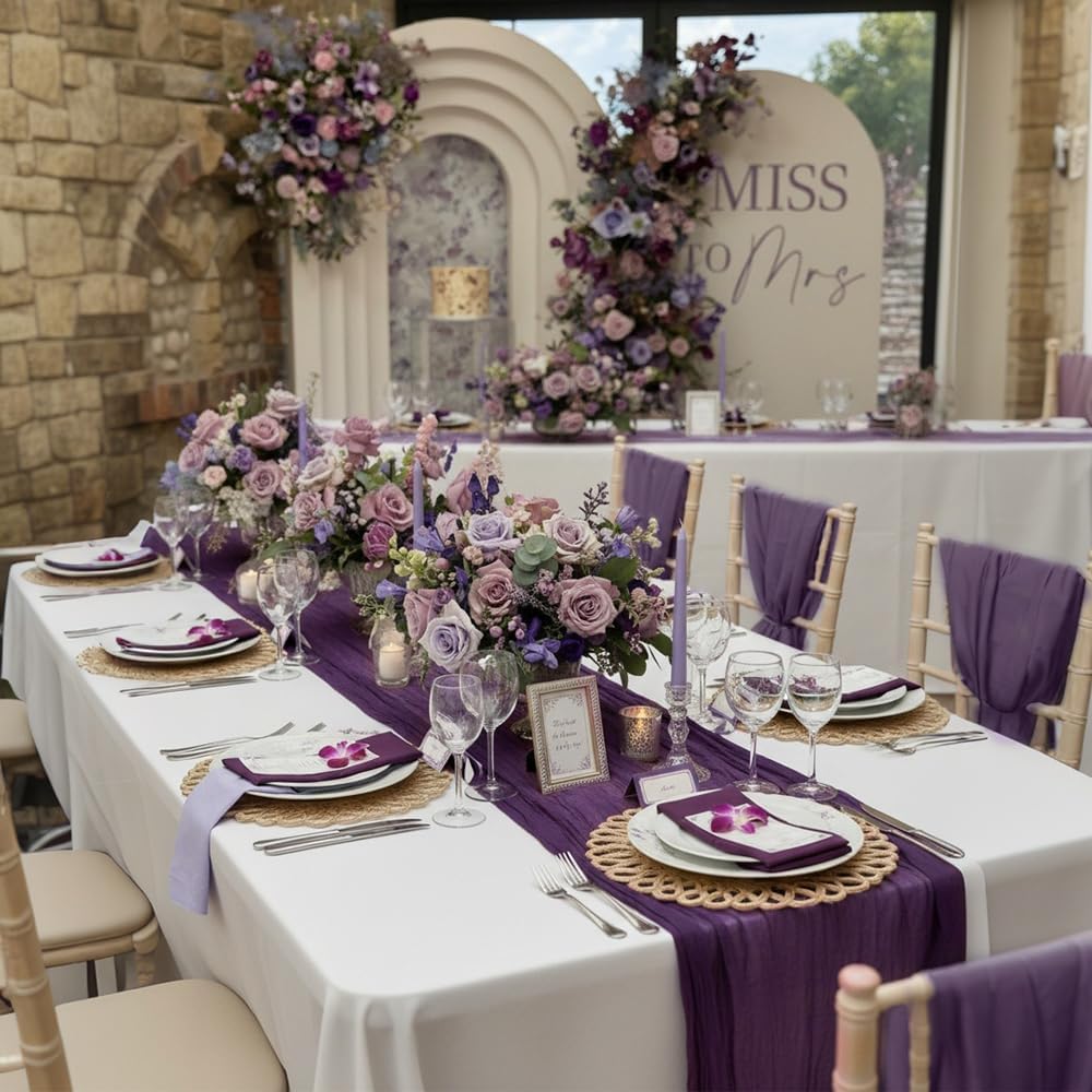 - 🍇【Versatile Purple Cheese Cloth Table Runner】This boho-style plum purple table runners 6 pack perfect for any event, including weddings, banquets, bridal or baby showers, wedding arches, receptions, candy buffets, ceremonies, and many more special events&holidays.It can also be applied to spicing up home curtains, fireplace, sofa, dresser runner and any other furniture that needs a romantic touch. It's an excellent addition to any event decoration and gives a touch of elegance to your overall decor that is both romantic and charming.
