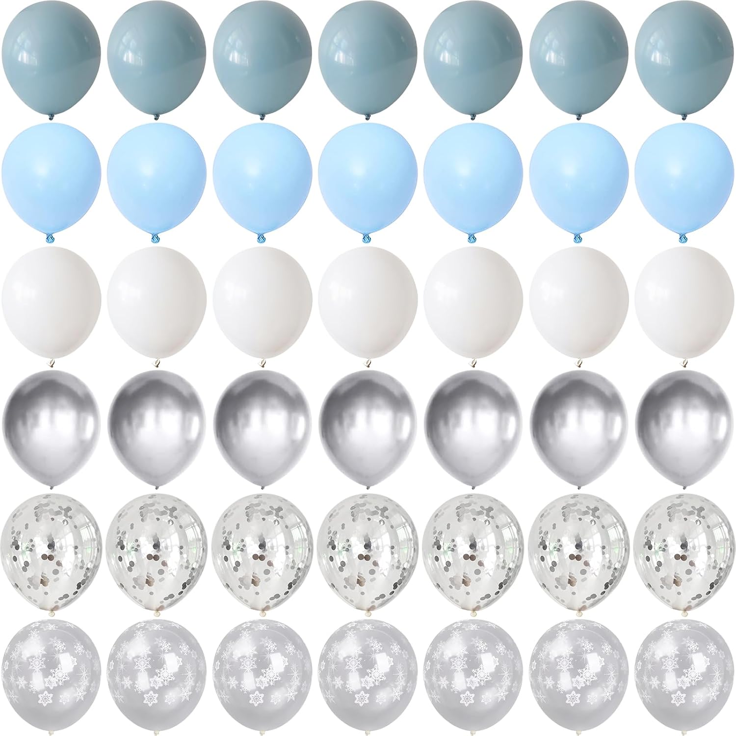 - Party Balloons Set: The winter wonderland balloons set have 60pcs 12inch helium balloons, include 13pcs ice blue balloons, 13pcs light blue balloons, 12pcs white balloons, 8pcs chrome metallic silver balloons, 7pcs metallic chrome silver confetti balloons, 7pcs clear snow balloons, and 2pcs white balloon ribbon.