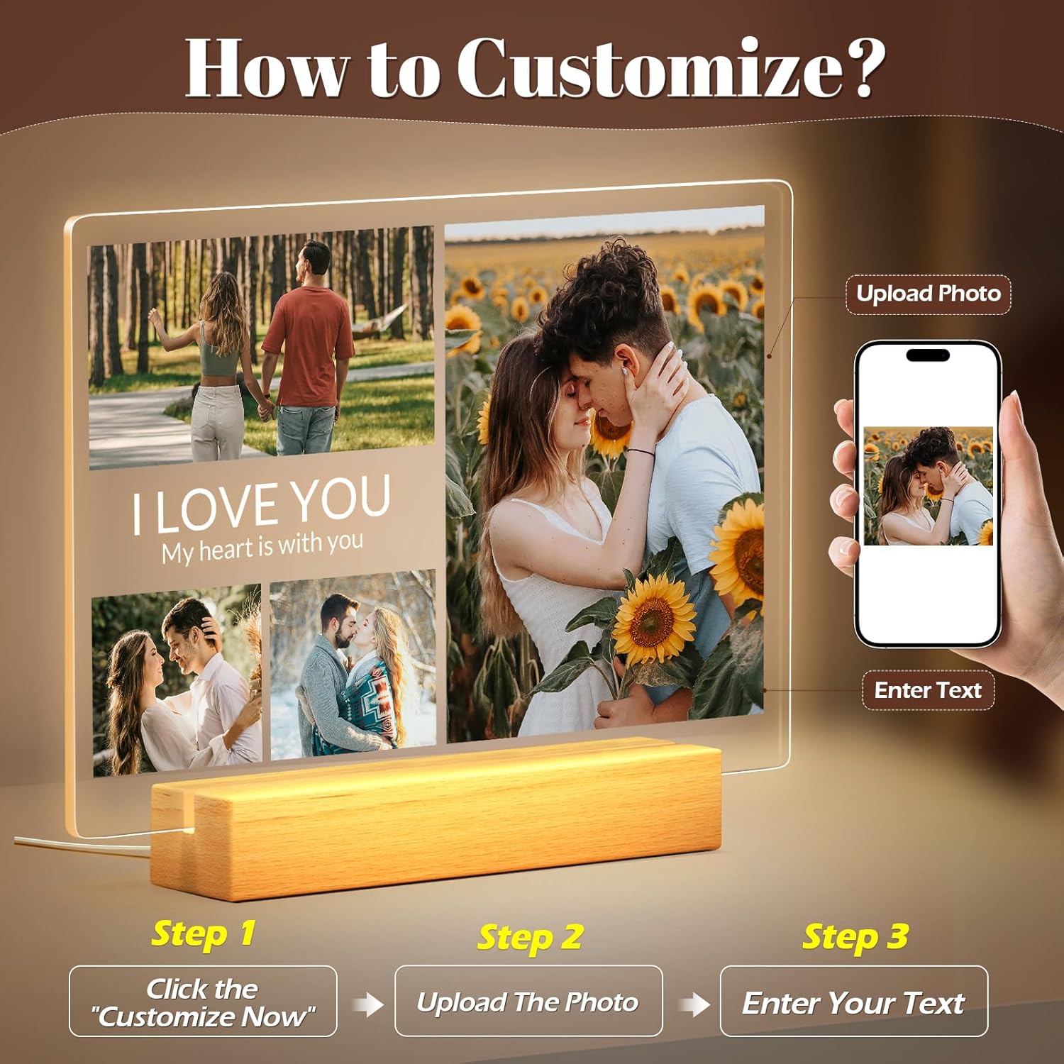 - Multiple Night Light Options: The custom acrylic photo frame’s wooden base is available in three lighting styles: warm light, 3-color light, and 7-color light. These options let you create the perfect ambiance for any occasion, adding romantic warmth to your home decor.