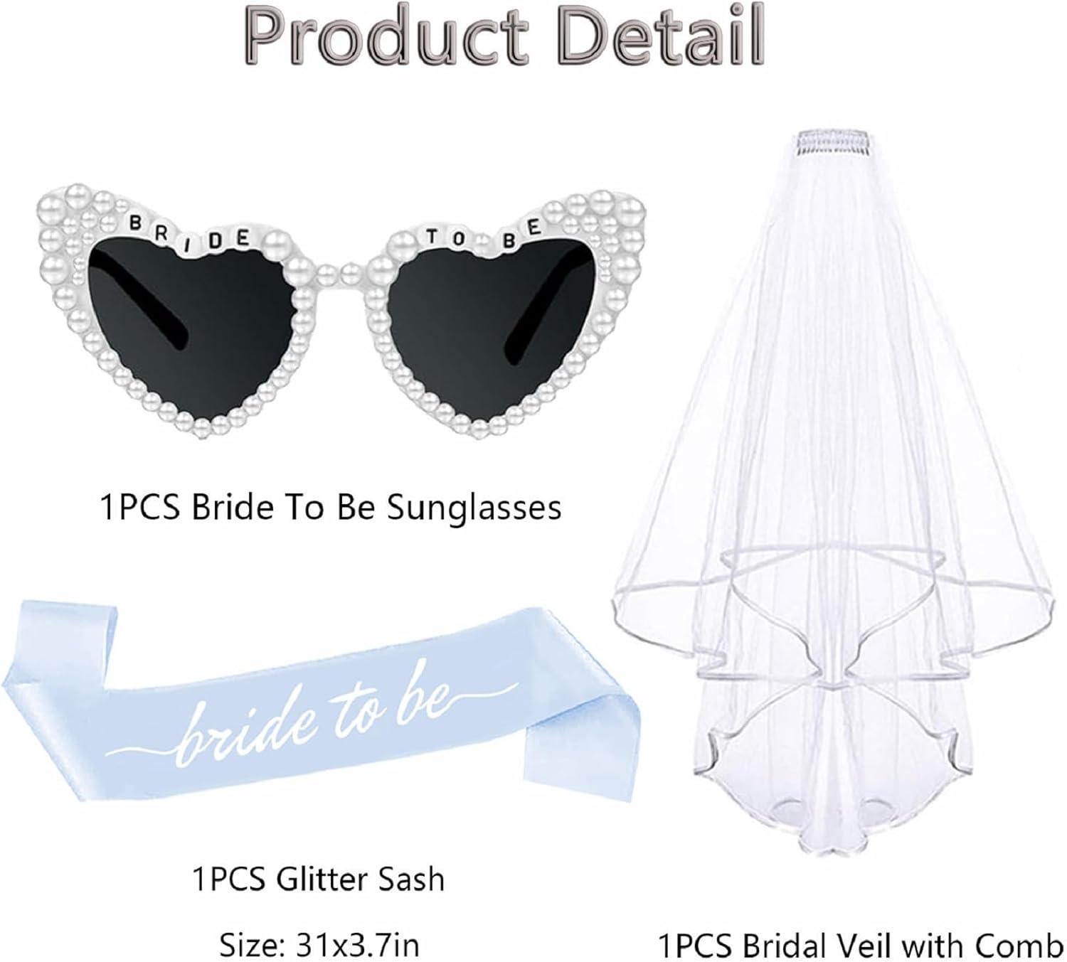 - 【Bachelorette Party Favors】You will receive: 1 x heart pearl "BRIDE TO BE" sunglasses, 1x blue "Bride to Be" satin sash, 1x layer veil. This bridal shower set will be the most beautiful accessory for bride to be and the most thoughtful gift for her
