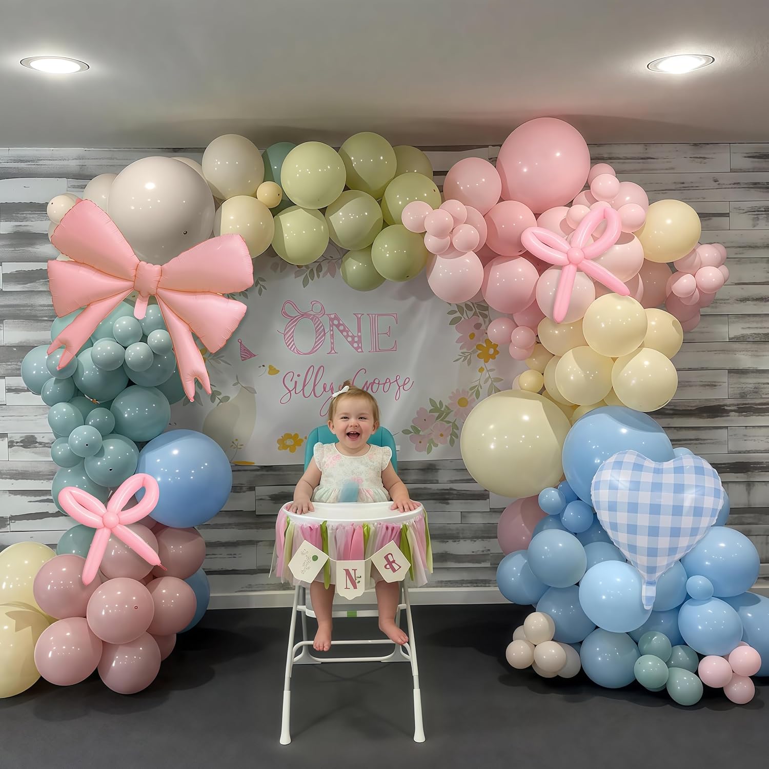 Goose Balloon Arch Kit Pastel Pink Blue Sage Green Balloons Garland with Bow Gingham Heart Foil Goose Birthday Decorations Girls Dusty Pink Blue Olive Yellow Duck Baby Shower Gender Reveal Party Decor