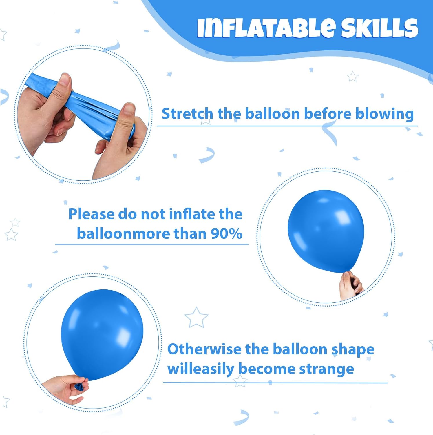 - Balloon material: All balloons are made of natural latex, and each balloon has been strictly hand-tested. The balloons are elastic, non-toxic, harmless and safe. They can be filled with air or helium, and it is recommended to use with a balloon pump