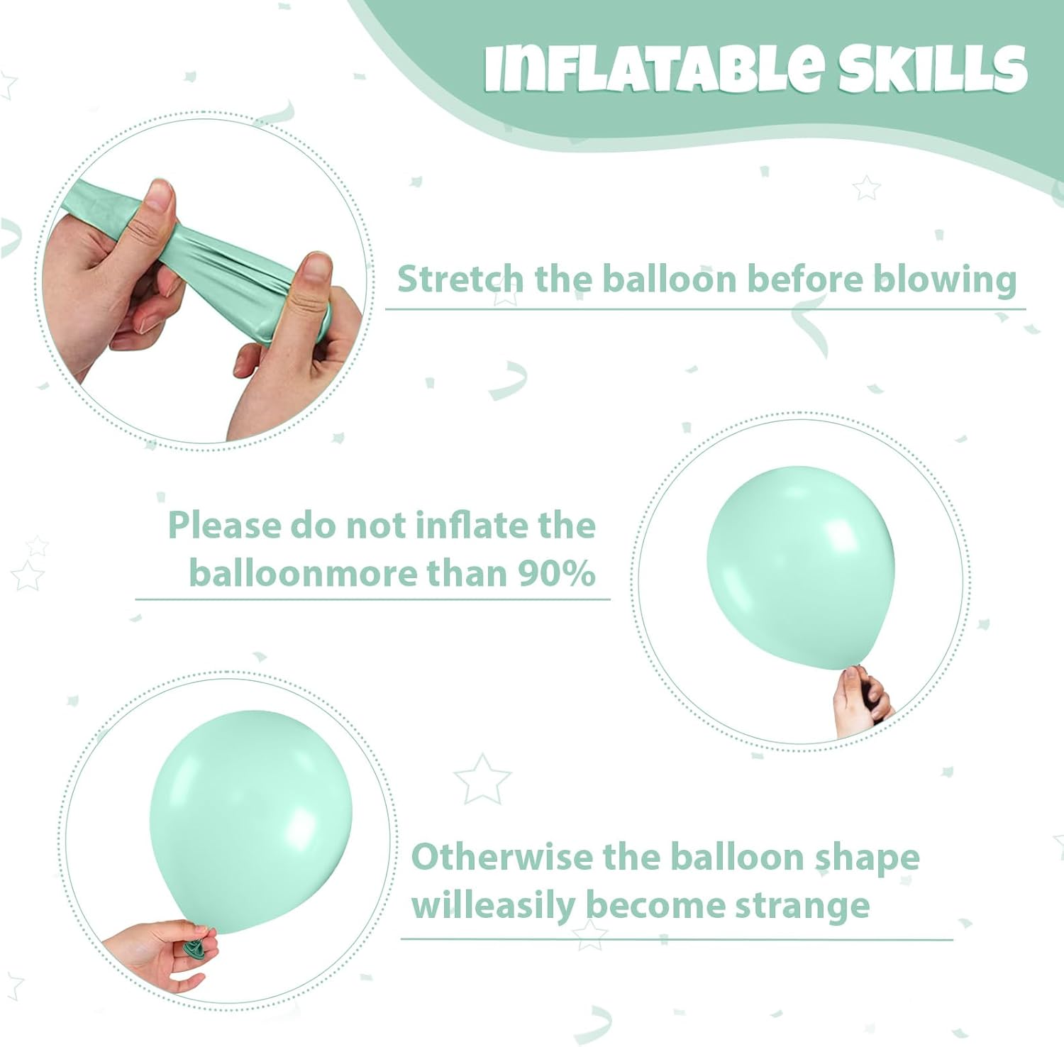 - Balloon material: All balloons are made of natural latex, and each balloon has been strictly hand-tested. The balloons are elastic, non-toxic, harmless and safe. They can be filled with air or helium, and it is recommended to use with a balloon pump