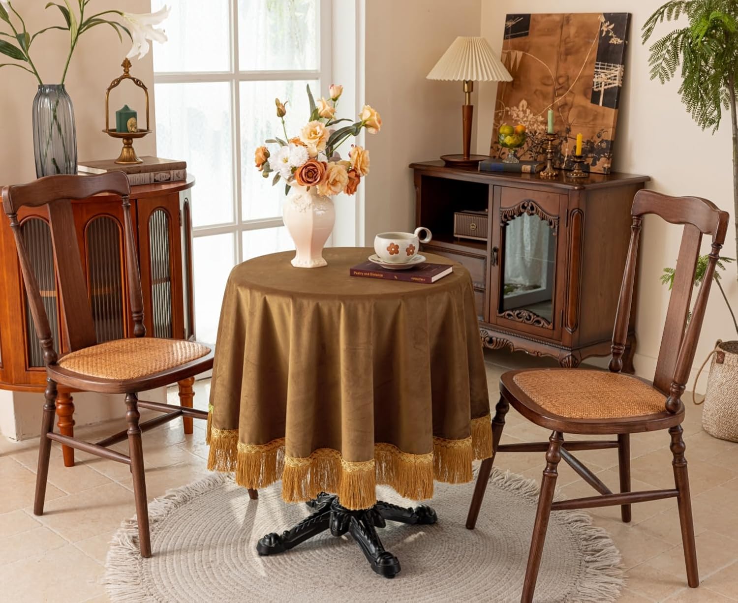 F-CHU Camel Tablecloth Thickset Velvet Tablecloth with Beautiful Gold Tassels Vintage Table Cloth for Home Decor Wedding, Party, Banquet and Events 70" Round