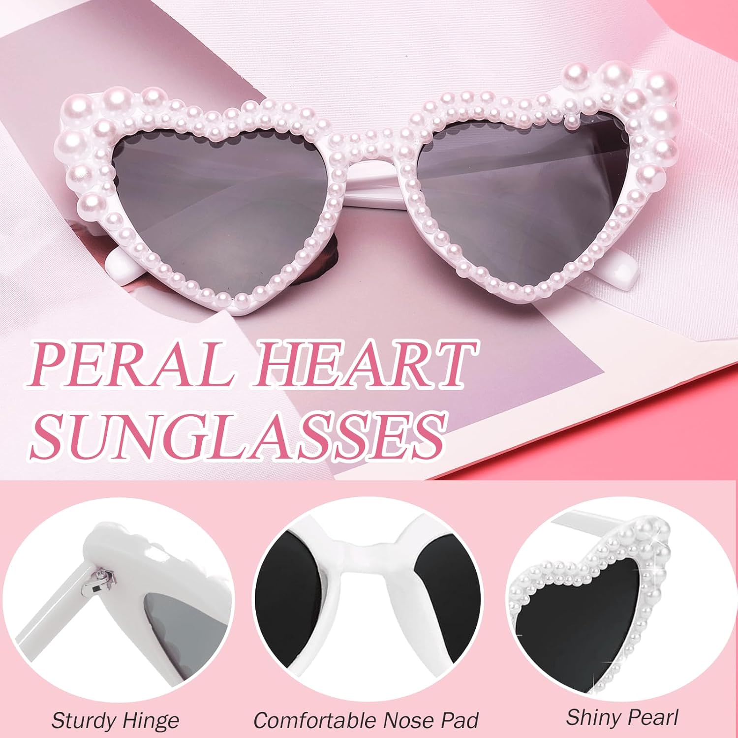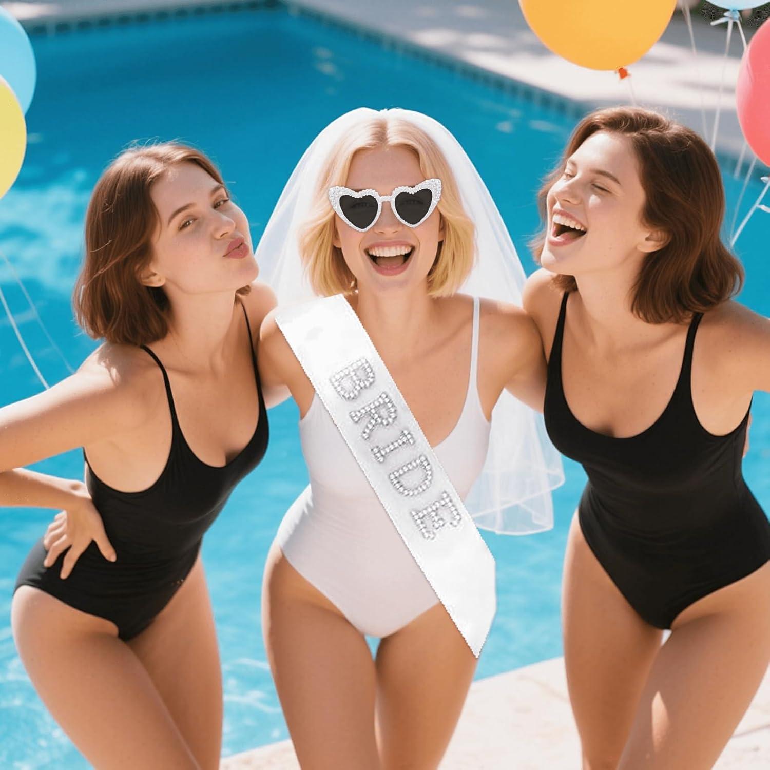- The Ultimate Bride Accessory: This set features a white heart shaped pearl sunglasses and an elegant white pearl ‘BRIDE’ sash, slay the photos and look absolutely stunning. No bachelorette party is complete without this iconic bride sunglasses & sash making an appearance