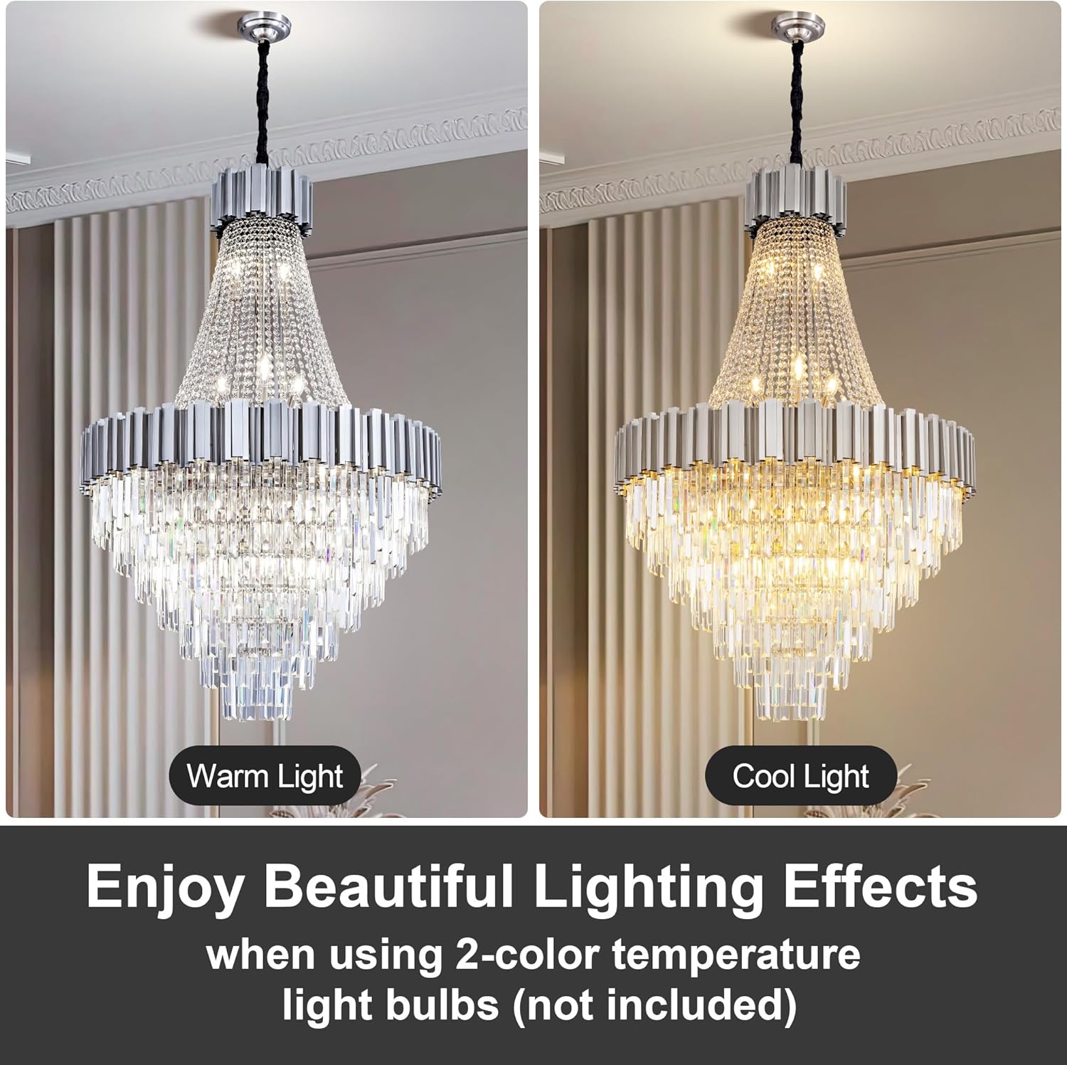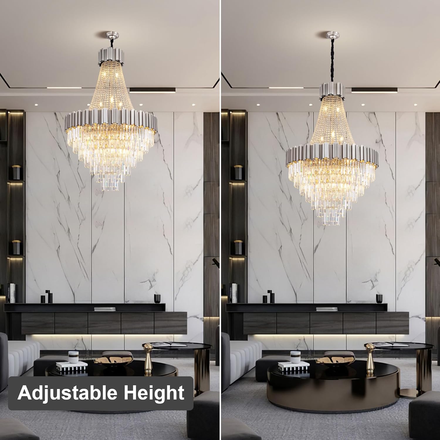 - 【Luxury High Ceiling Chandelier】This stunning modern chandelier is crafted with premium silver frame and 100% top K9 transparent crystals that exude a diamond-like brilliance. With 420 sparkling crystals adds brilliance and sophistication, each crystal refracts light beautifully, creating a dazzling, luxurious atmosphere for your home.